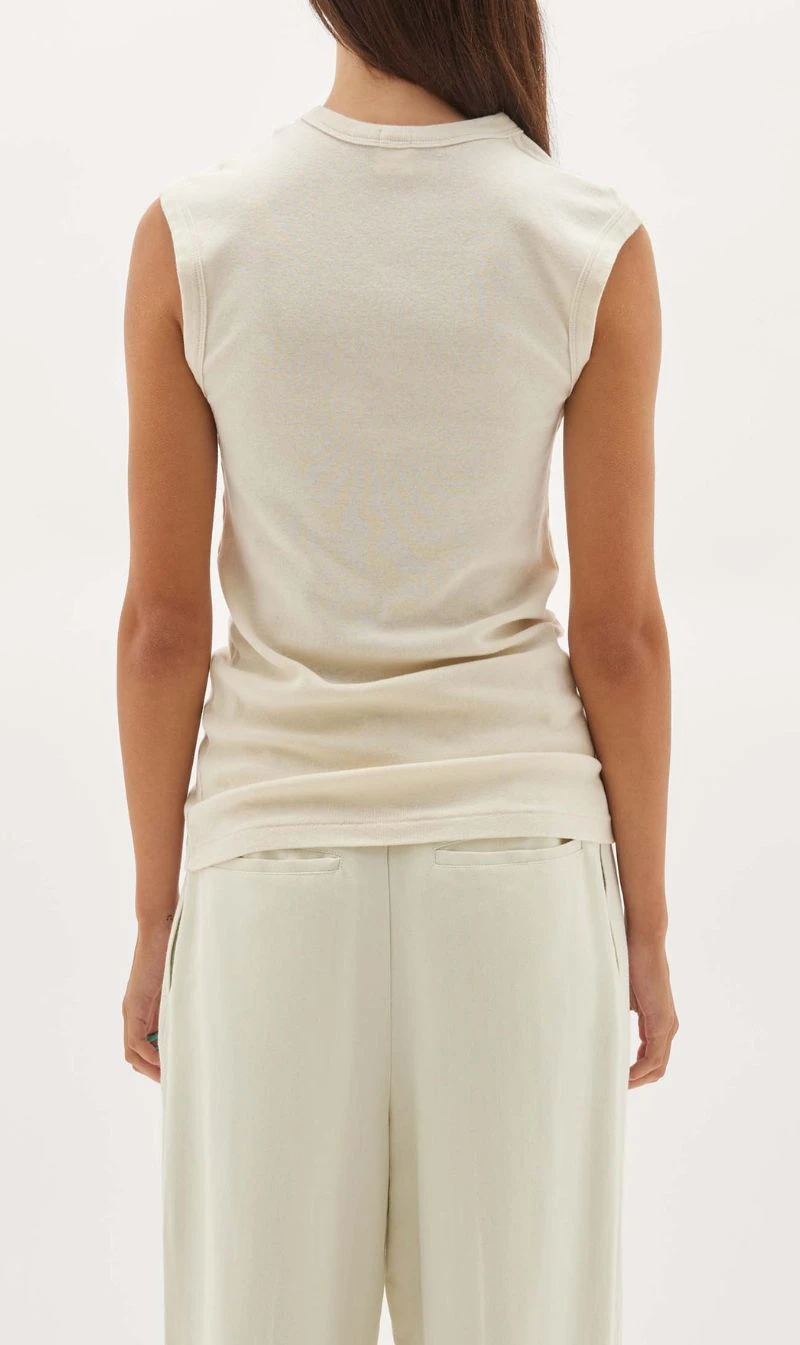 The Slim Superfine Rib Muscle Tank in Salt from Bassike is a slim fit tank in superfine organic cotton rib. featuring cotton wide bind and Bassike contrast topstitch on back neck.