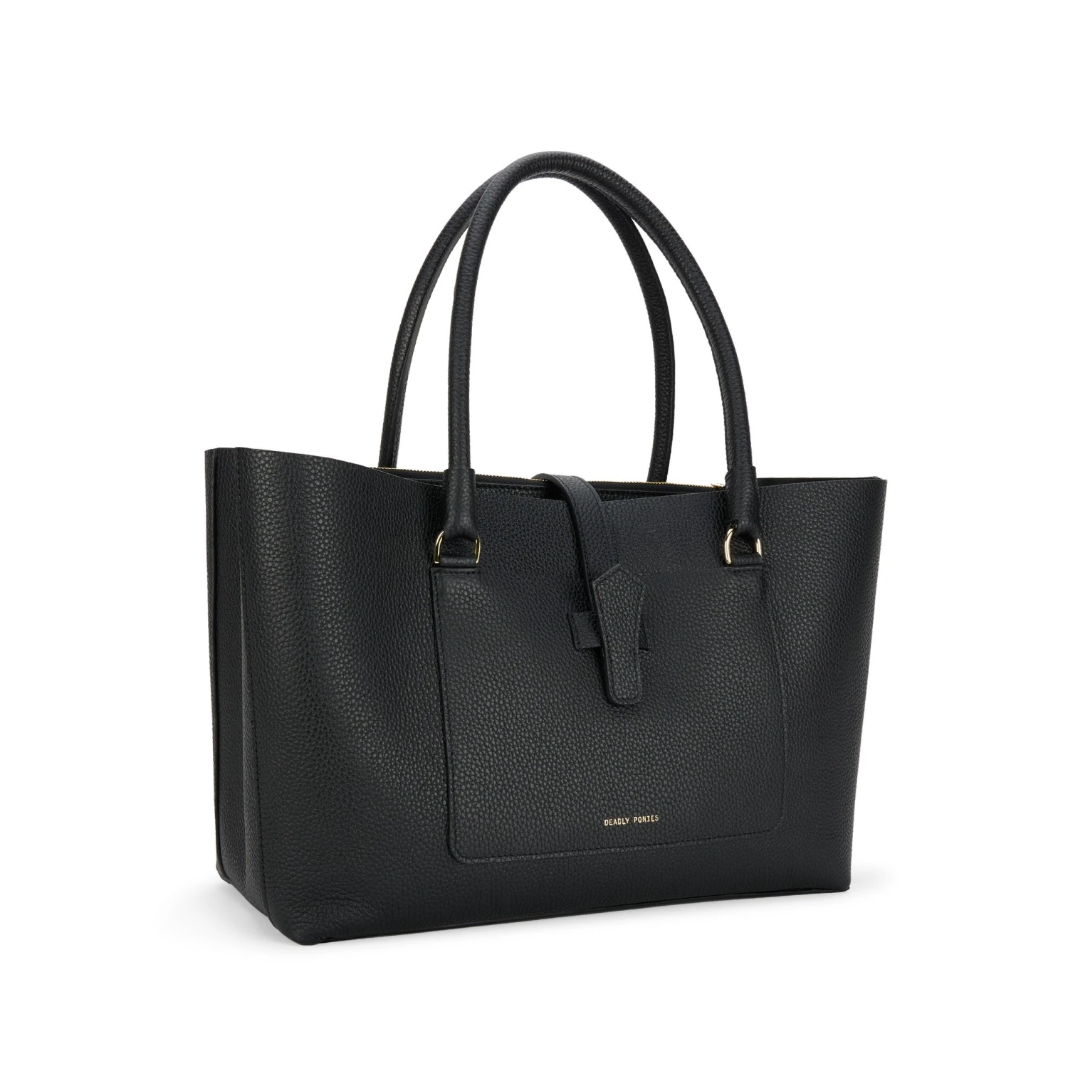 The Deadly Ponies Mr Breton in Black is the newest member of the Deadly Ponies tote family. Featuring a generous landscape silhouette, that is perfected for work and travel. Crafted with a generous zip compartment, slip pocket, and an internal card slot, that is all secured with the leather tab closure. Carry him in your hand, or on your shoulder with the dual handles. Designed to fit a 15″ laptop, making it perfect for your work and daily life.