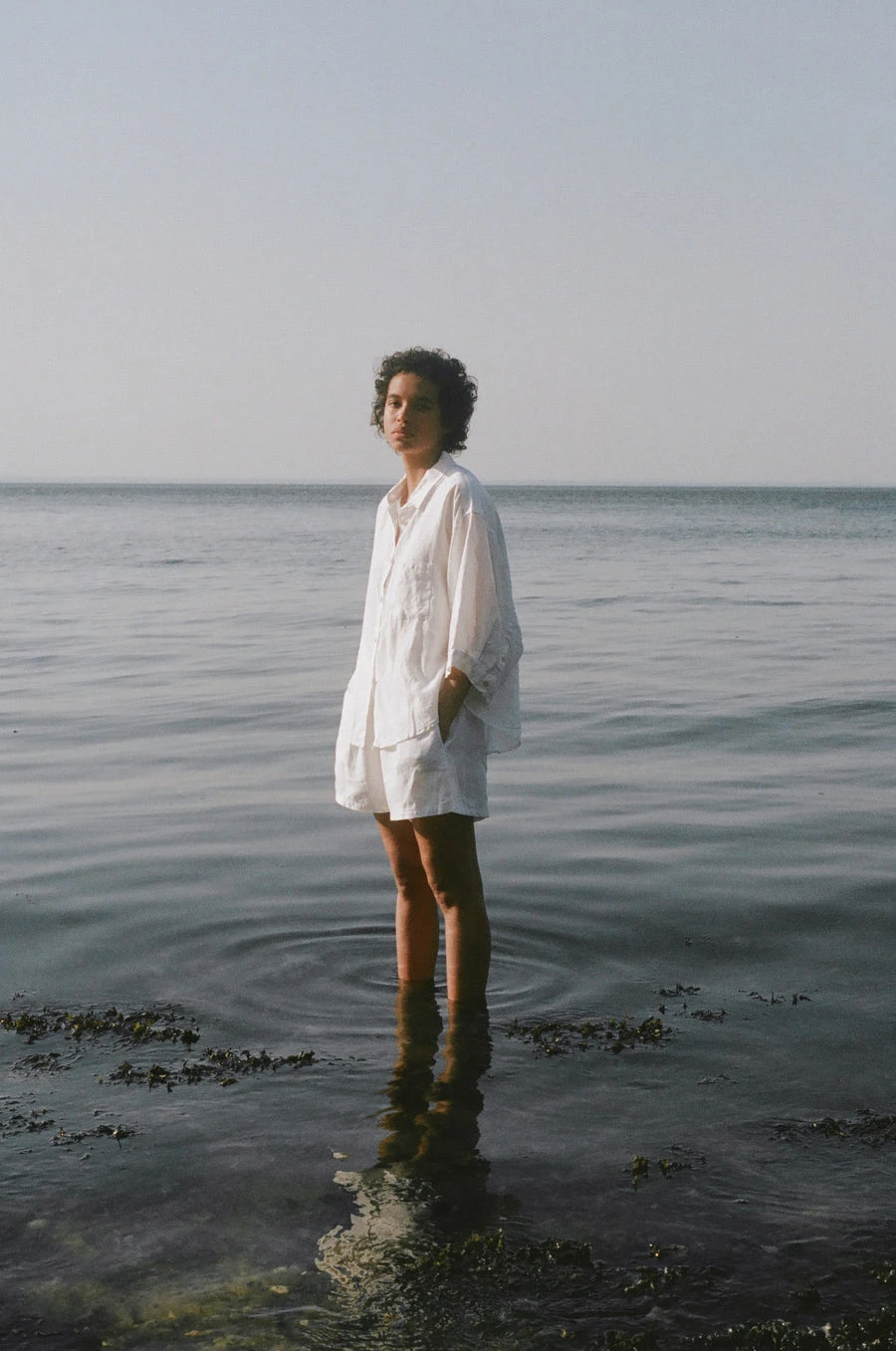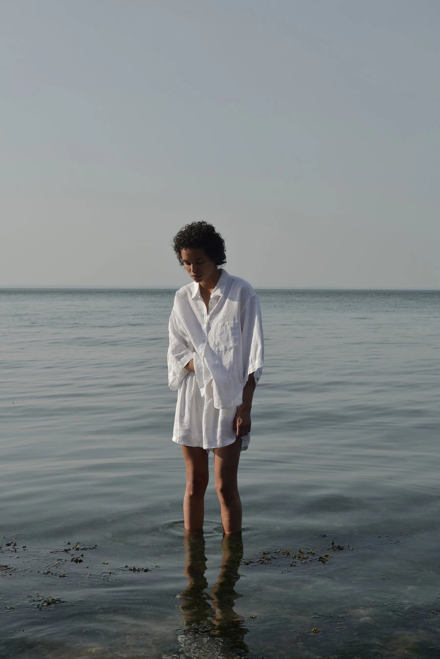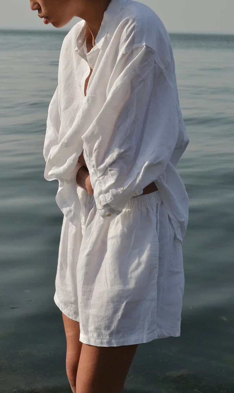 The 03 set by Deiji Studios in White is both simple and relaxed. Featuring an oversized box-fit linen shirt with wide arms and a front pocket, this romantic shirt can be worn separately or together with the matching shorts – a mid-rise, the loose-fitting boxer style shorts have a faux button-down fly and an elastic waist for extra comfort.