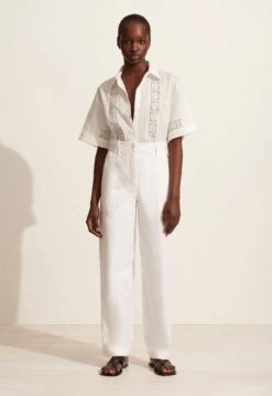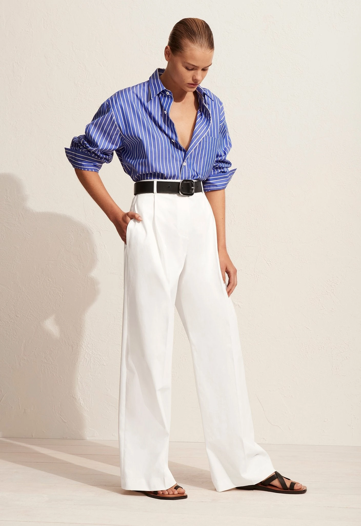 The Matteau Classic Stripe Shirt in Lapis. A classic man-style cotton shirt with a single front pocket in a timeless stripe. Relaxed fit with front and back curved hem. 100% Organic Cotton.
