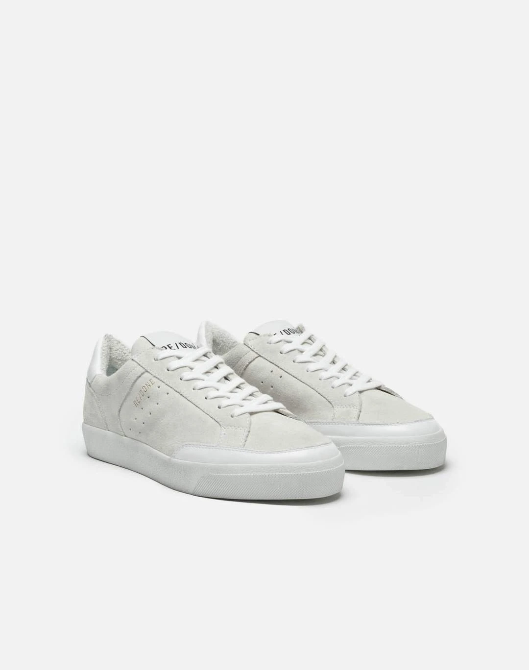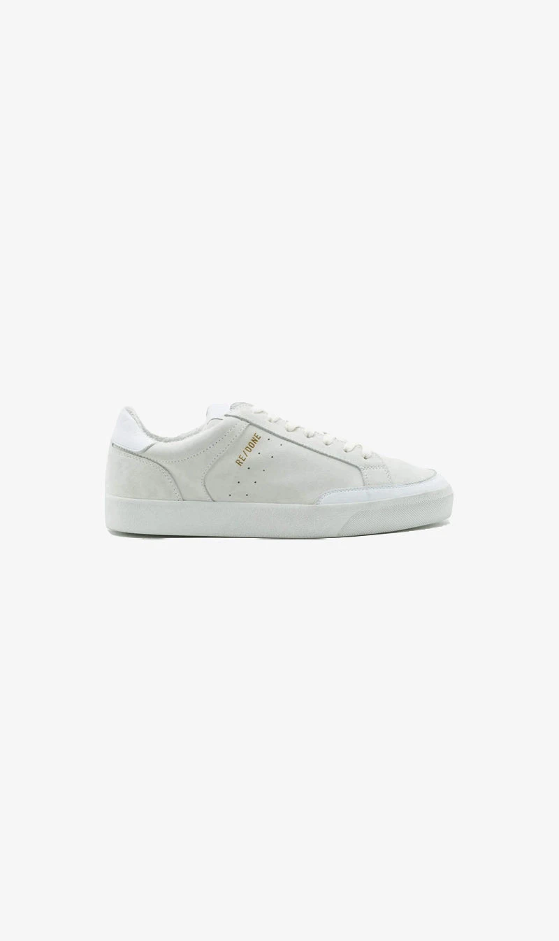 The Re/Done Skate Shoe in Whiet Suede. A 90s Skate Shoe, inspired by the decade’s most iconic subculture, finished in all over suede with a vintage wash.