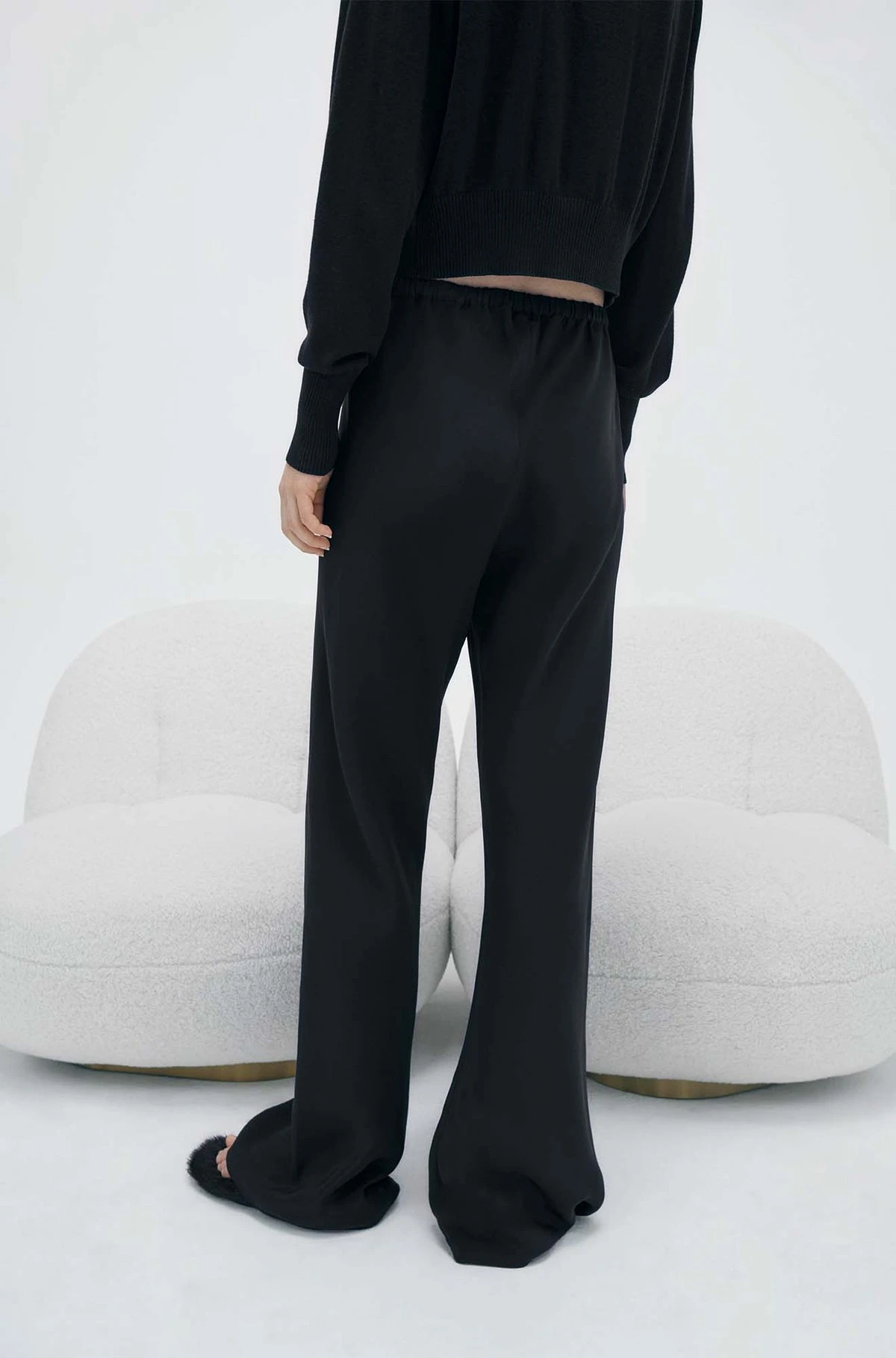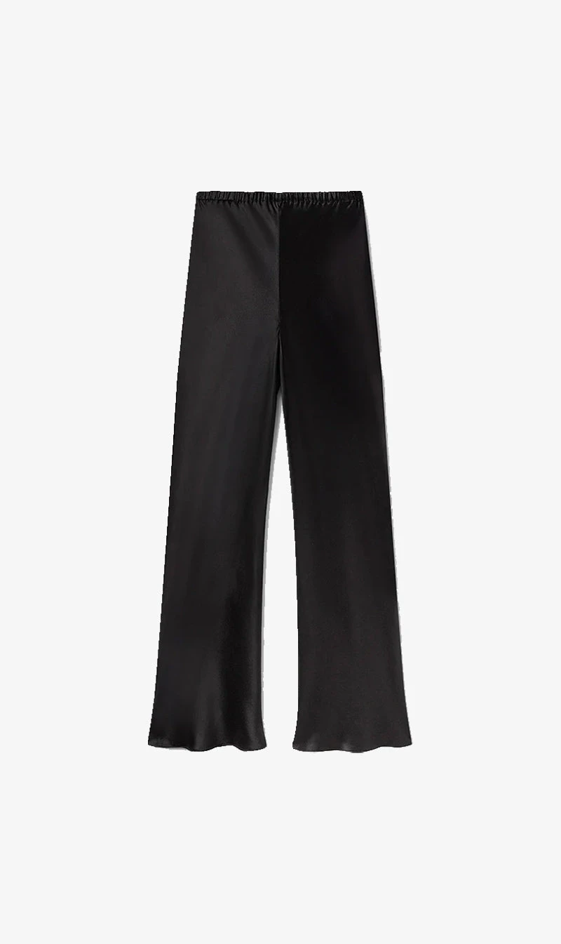 The Silk Laundry Bias Cut Pants in Black. The everyday pant, cut from 100% silk satin. A signature style that falls into a fluid silhouette with a slight flare. Its elasticated waistband sits high above the hip, pulling in to highlight the waistline. Combining elegance, comfort and style, it’s a piece that will complement any wardrobe.