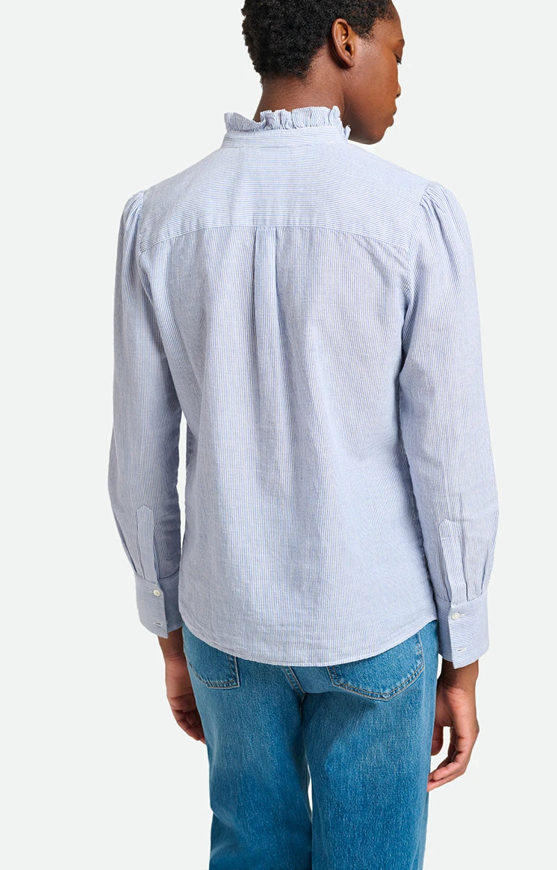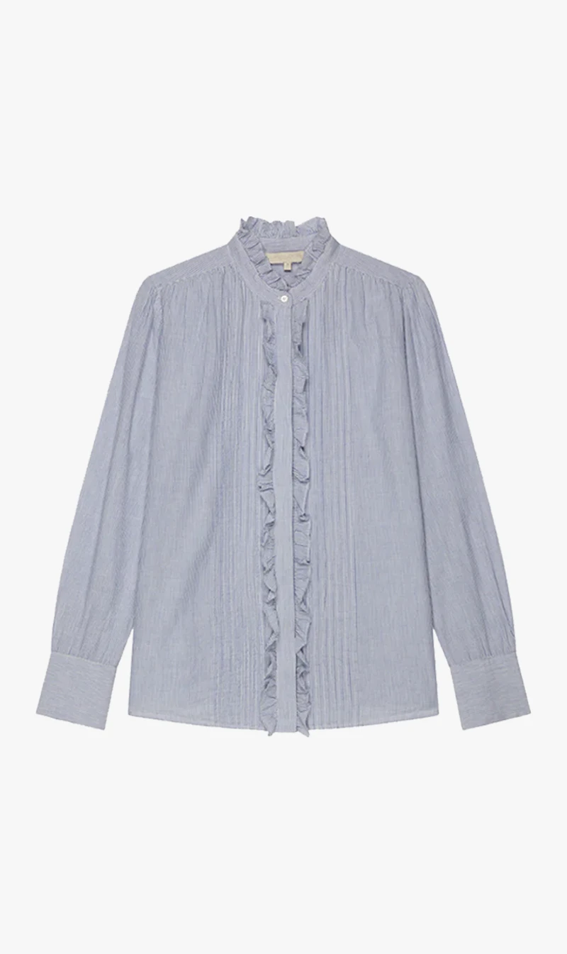 The Vanessa Bruno Nicolas Blouse in White/Blue is a modern spin on a classic. Featuring a ruffled and pleated button up front, with a frilled collar. Pair yours tucked into jeans or tailored pants.